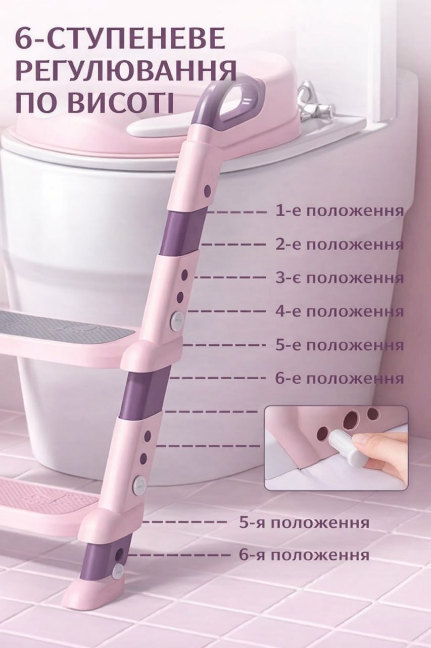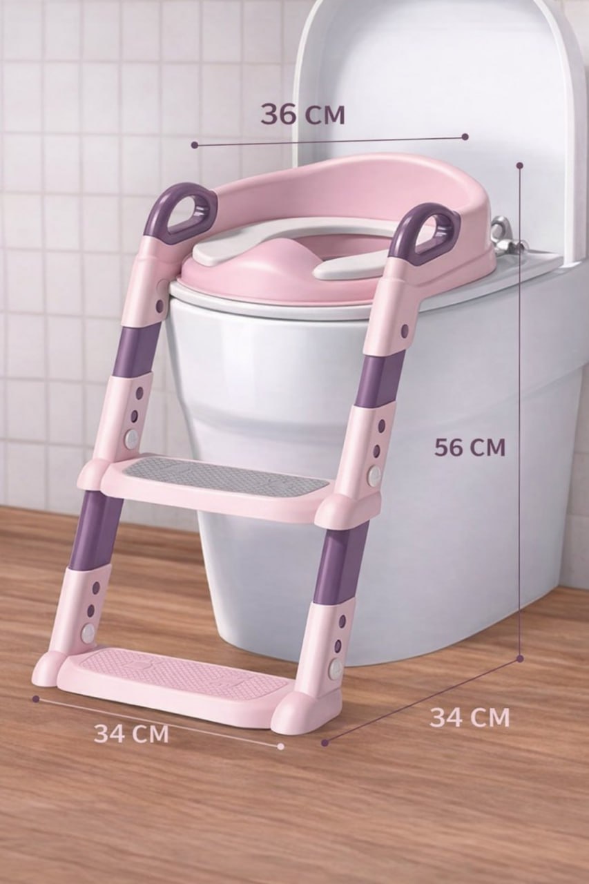Дитяче сидіння для унітазу зі сходинками та ручками допомагає дитині швидко й без страху перейти від горщика до унітаза. Стійка конструкція, нековзна сходинка та регульована висота забезпечують максимальну безпеку й комфорт.